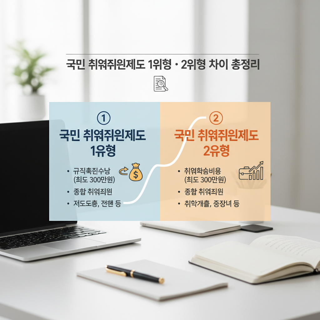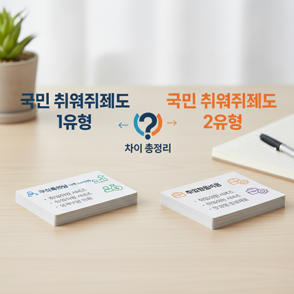 크게 두 가지 트랙으로 나뉘는데 이게 1유형이랑 2유형이에요. 근데 사람들이 제일 헷갈려 하는 게 도대체 내가 어디에 속하느냐는 거임. 소득이랑 재산 따지고 뭐 따지고 머리 아픈데, 심플하게 생각하면 돈이 급하냐 아니면 기술 배우는 게 급하냐 차이로 갈린다고 보면 됩니다. 물론 내가 고르고 싶다고 골라지는 건 아니고 조건이 맞아야 하지만요.